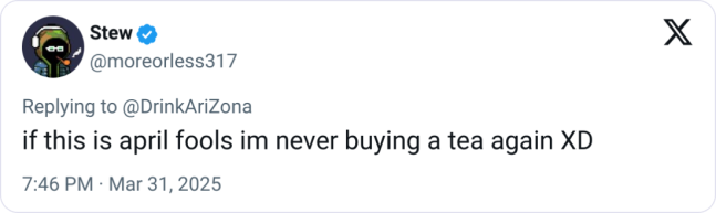 It wasn’t until today, April Fool’s Day, of course, that it’s seemingly been an elaborate prank the whole time. AriZona took to social media again, but this time fans weren’t as excited.