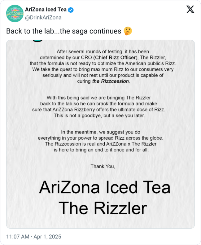 Yesterday, March 31st, Arizona took to social media to announce a new flavor called “Rizzberry,” saying it would be coming soon.