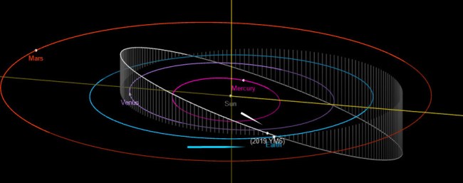 2019 YM6 is a very small asteroid whose orbit crosses the orbit of Earth. NASA JPL has classified 2019 YM6 as a “Near Earth Asteroid” due to its orbit’s proximity to Earth, but it is not considered potentially hazardous because computer simulations have not indicated any imminent likelihood of future collision.