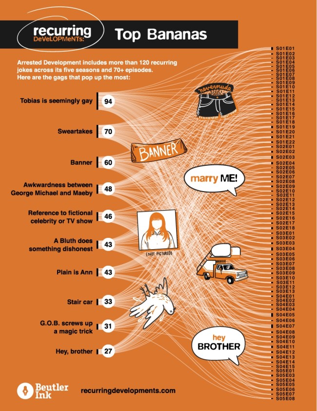 Beutler Ink and Red Edge recently put together Recurring Developments, a website tracking every single running joke from Arrested Development. If you want to go down a rabbit hole of comedy, I highly suggest exploring the data for yourself, but they also rounded up the most frequent gags in a mesmerizing chart that proves just how much thought goes into writing the show.