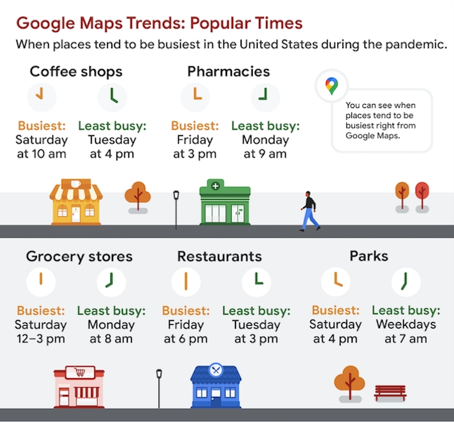 Thankfully, Google was nice enough to compile a bunch of data collected between the onset of the current situation up to October to shed some light on this particular conundrum to determine the best time to do some grocery shopping, grab a bite to eat at a restaurant (which you probably shouldn’t be doing right now based on current trends), and even make a trip to the park if you’re even more paranoid than I am about posting up in the outdoors.