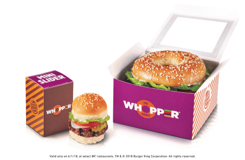 Burger King claims that the Whopper Donut is the “first flame-grilled donut ever” (it’s not Luther Burgers have been around for at least a decade). After the Whopper has a hole cut out of it, the remaining is served as a mini slider.