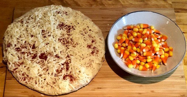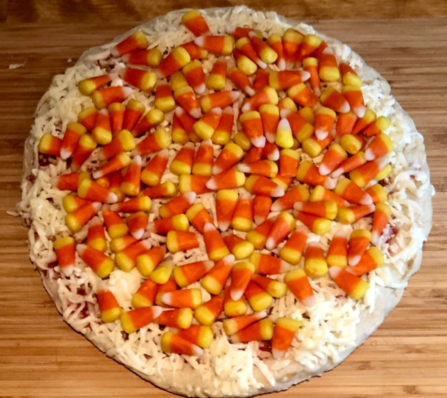 - Cover pizza in candy corn