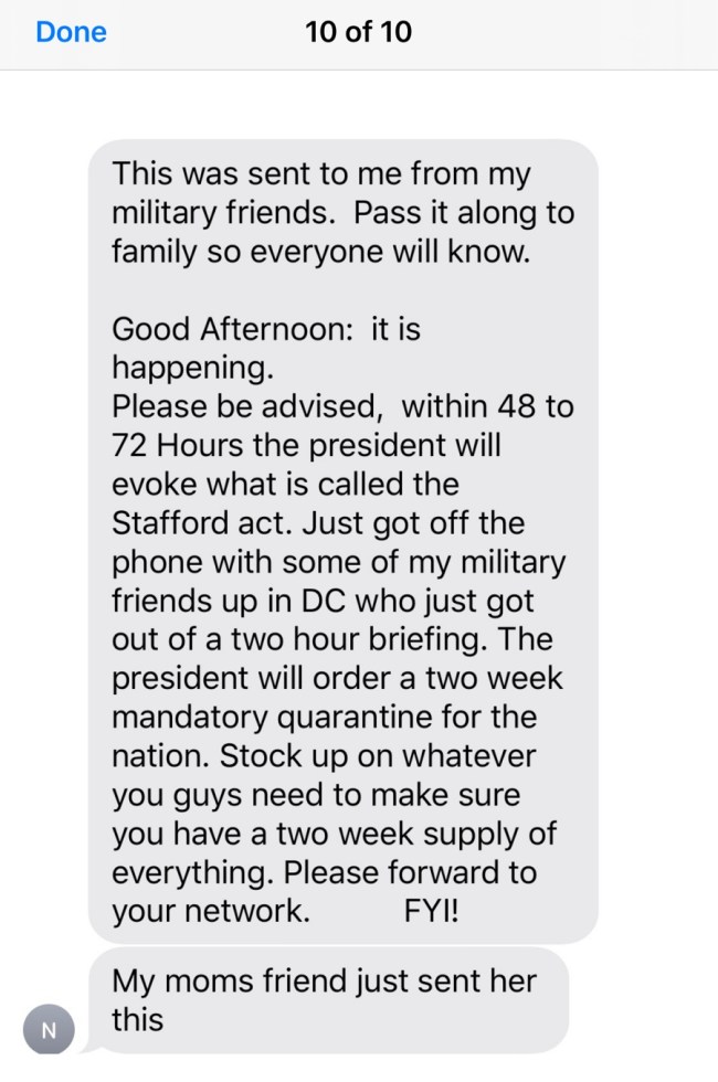 “In 48 to 72 hours the president will evoke what is called the Stafford act. Just got off the phone with some of my military friends in DC who just got out of a two hour briefing. The president will order a two week mandatory quarantine for the nation. Stock up on whatever you guys need to make sure you have a two week supply of everything. Please forward.”