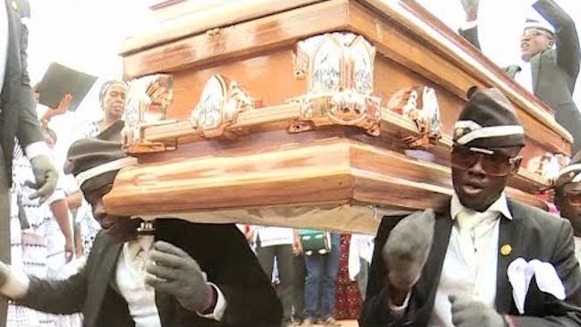On Saturday, fairly noted maker of internet jokes Dan Nolan brought a video to my attention featuring someone on a motorcycle who launched themselves into orbit after veering off a road before it abruptly cut to a clip of a group of dancing pallbearers from Ghana (all set to “Astronomia, and EDM song by Tony Igy).