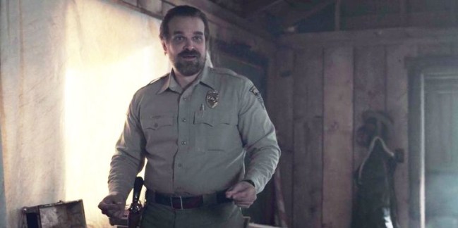 Next thing we know, Chief Hopper is posing with trombones and pom-poms in a senior yearbook photoshoot.