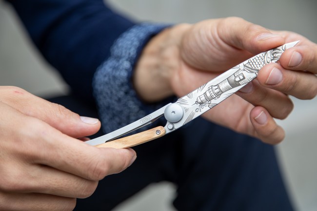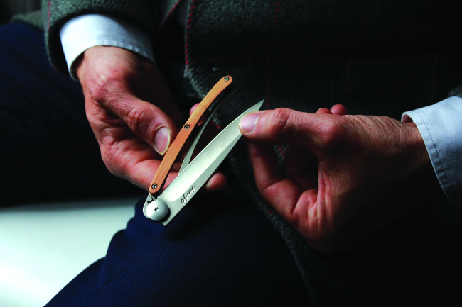 My desperate hope was that the Deejo’s beautiful titanium finish and a handle made from precious wood would distract The Boys from the fact that I had been unsuspectingly watching them from afar. I prayed that the most elegant pocket knife on the market would divert their attention away from my felony.