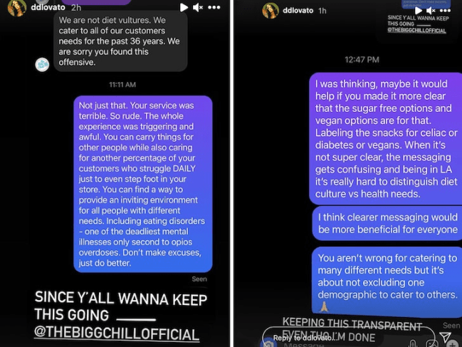 Lovato responded that the labeling of the food items wasn’t her only problem with the shop. She also called them rude, said their service was terrible, and that “the whole experience was triggering and awful.”