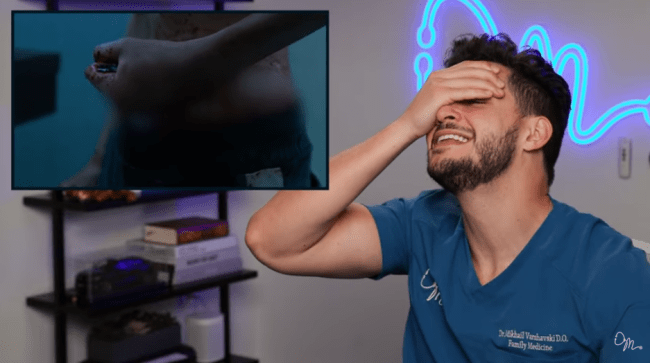 “He just casually popped out the bullet with a knife,” says Doctor Mike. “That was a fairly close range shot, that’s going deeper than just superficial that you can just pop it out. Like, that’s going deep into your shoulder. This is so unrealistic.”