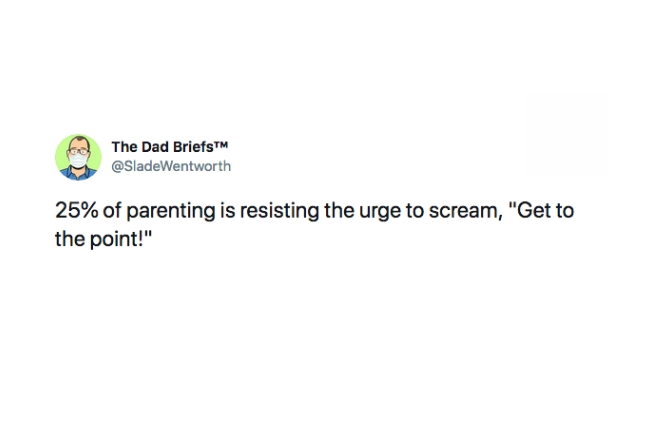 25% of parenting is resisting the urge to scream, "Get to the point!"