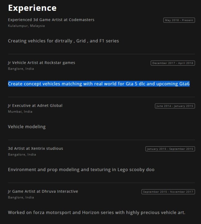On Thursday, an astute member of the GTA Forums started a thread after stumbling upon the résumé of a former employee at Rockstar India who listed Grand Theft Auto 6 among his body of work.