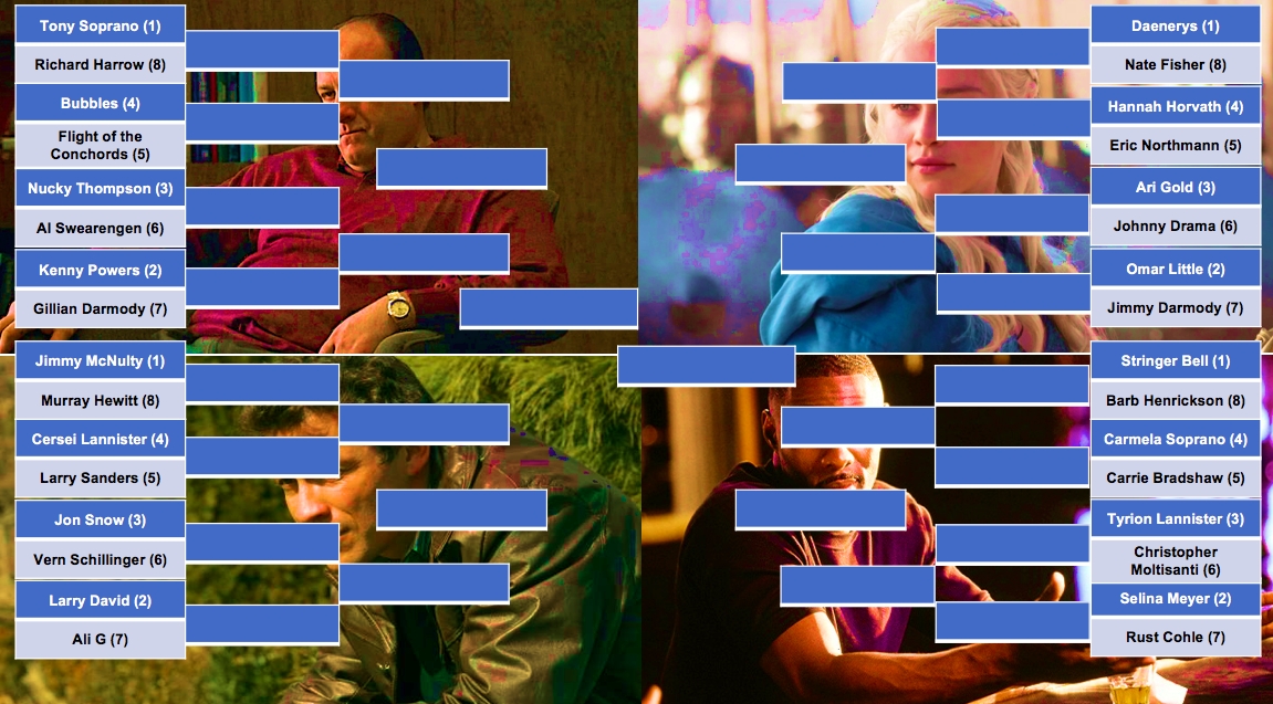 The tournament’s four number-one seeds are Tony Soprano of The Sopranos, Daenerys Targaryen of Game of Thrones, and Jimmy McNulty and Stringer Bell from The Wire (Tony is the number one overall).