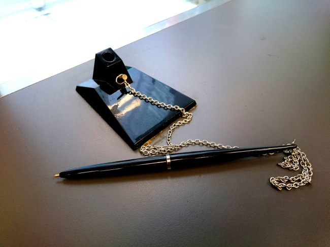When you finally make it in front of the exhausted Post Office employee after watching The Irishman on your iPad while waiting in line, you’ll notice a shackled pen. You may be led to believe that this is a special pen, filled with the ink Hancock used to sign the Declaration of Independence, worthy of a security measure not allotted to normal pens.