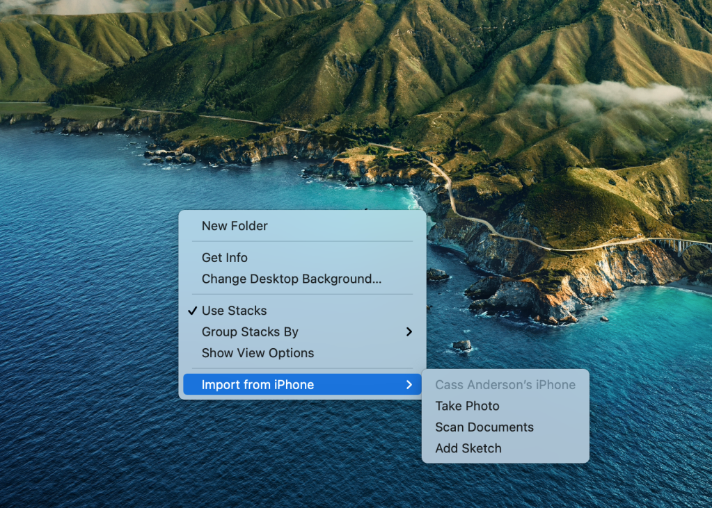This is a simple as right-clicking anywhere on Finder/on your desktop that isn’t a file. You then choose Import From iPhone -> Scan Documents. Once you do this, your laptop automatically syncs with your iPhone and you are able to scan any documents. After you have finished scanning any and all documents your iPhone automatically saves those document scans as .pdf files to your desktop.