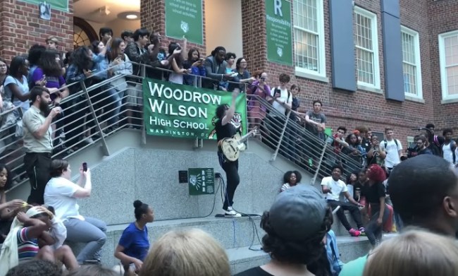 I can’t say that anything even close to this ever happened on my H.S. campus. We occasionally had a motivational speaker come in for afternoon assembly, maybe we had some authors. But we never had one of Rolling Stone‘s top 100 guitarists show up on campus and play an impromptu concert in the quad, nothing like this:
