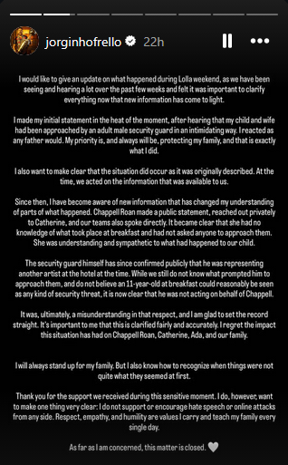 “The security guard himself has since confirmed publicly that he was representing another artist at the hotel at the time. While we still do not know what prompted him to approach them, and do not believe an 11-year-old at breakfast could reasonably be seen as any kind of security threat, it is now clear that he was not acting on behalf of Chappell.”