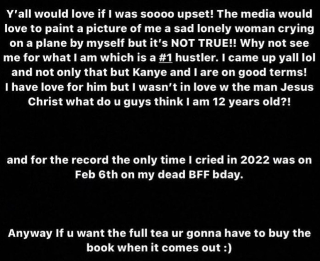 “Why not see me for what I am which is a #1 hustler. I came up yall lol and not only that but Kanye and I are on good terms! I have love for him but I wasn't in love with the man Jesus Christ what do yiu think I am, 12 years old?!”