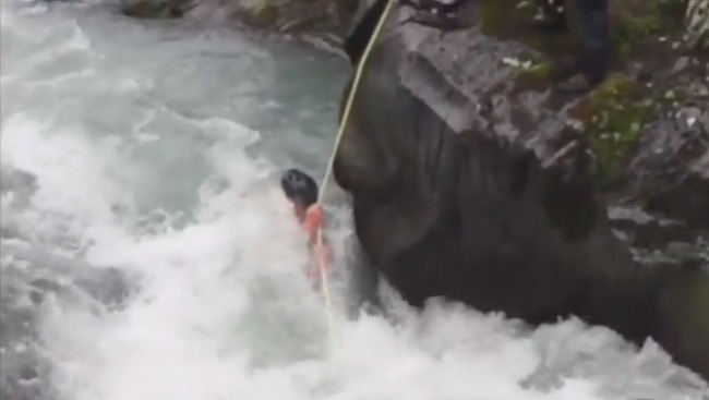 Daniel Hartung was on his first ever kayaking trip, paddling the Six-Mile Creek near Hope, Alaska. The rushing rapids were too much for Hartung and he was thrown from his kayak and sucked down the river. When Daniel made it to a rapid with other kayakers on the river bed the bystanders tried to rescue him by tossing Daniel a rope.