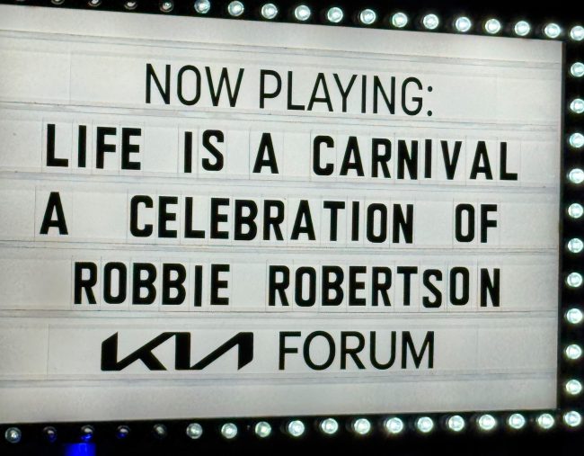 In August 2023, we lost Robbie Robertson at 80 years old. A Canadian icon, Robertson was not only the heartbeat of The Band but also Bob Dylan’s former guitarist, leaving behind a legacy that shaped the sound of rock for generations. To honor him, Blackbird Presents put together Life is a Carnival at LA’s Forum—a celebration of his life, his music, and the monumental influence he left behind. Blackbird, the same group that organized Willie Nelson’s 90th birthday at the Hollywood Bowl in 2023, pulled off yet another star-studded showcase to Robertson’s legacy.
