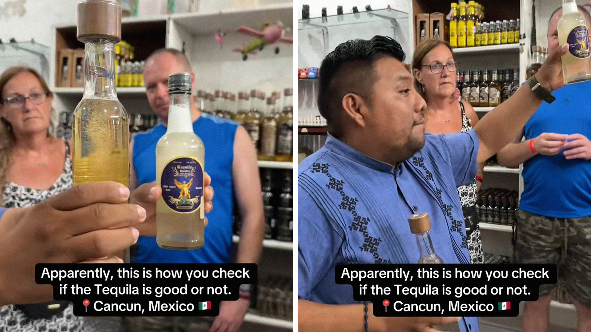 In a viral clip, TikToker @the.world.cruisers shared a quick lesson from a tequila store worker in Cancún, México. The TikToker films the man inside the store as he holds two different bottles of tequila. Several tourists crowd around him, hanging on to his every word.