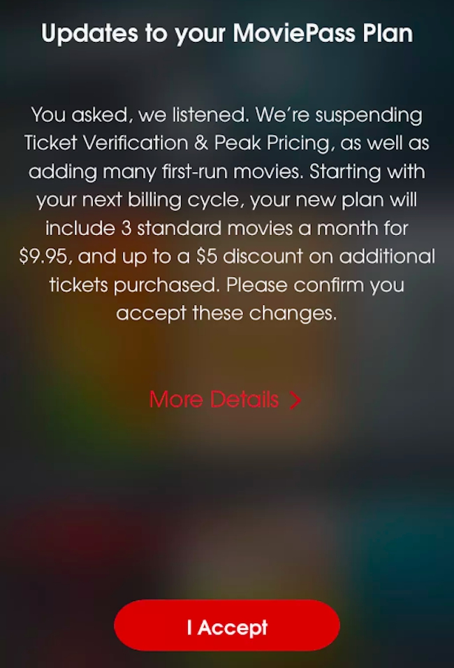 It appears that if you return to the app after canceling, you’ll receive a message about the details of the plan MoviePass will be offering going forward.