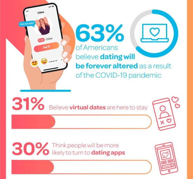This news comes from a survey of 2,000 Americans which revealed 63% believe dating will never be the same as a result of the pandemic — and 31% believe virtual dates are here to stay.