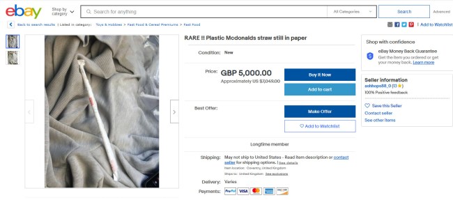 “Here we have one sealed McDonalds scoop straw and one sealed white straw with red and yellow pinstripes,” reads that listing. “McDonald’s no longer sell these, they will increase in value in 10 years.”