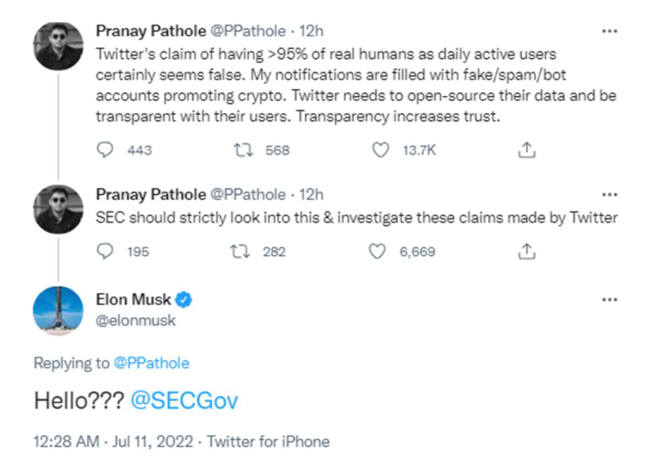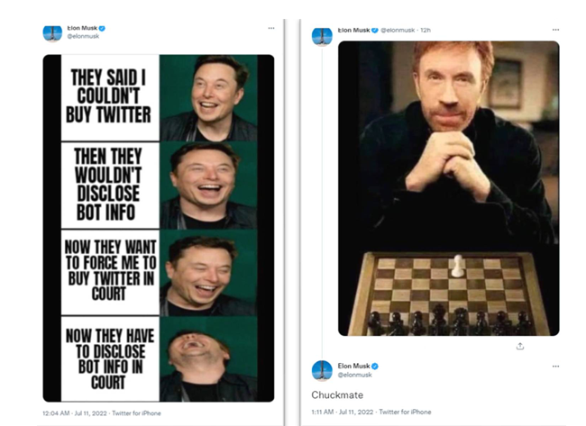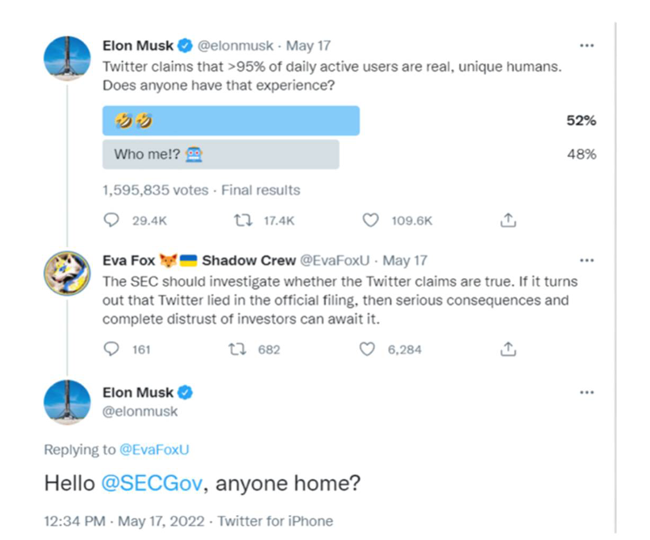 Musk “posts tweets implying that his data requests were never intended to make progress toward consummating the merger, but rather were part of a plan to force litigation in which Twitter’s information would be publicly disclosed.”