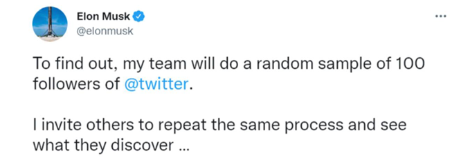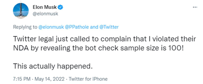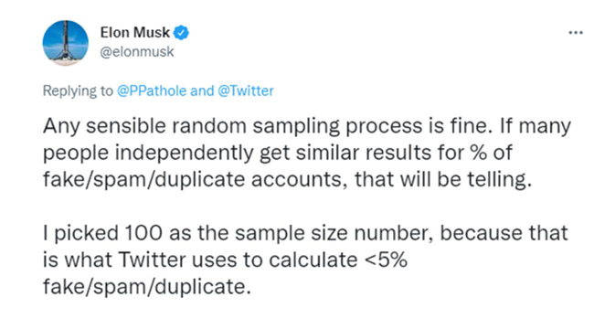 Musk tweets “a misrepresentation that Twitter’s sample size for spam estimates was just 100.”
