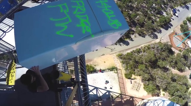 If you have ever wondered what would happen if you dropped items like a dishwasher, a La-Z-Boy chair, a microwave, a washing machine, a sink, a toilet, and a FREAKING refrigerator off a 150-foot tall tower, then today is your lucky day. And even if you never wondered, today is still your lucky day because that’s exactly what the boys did. (How they got the fridge up the 222 steps should be a whole other video.)