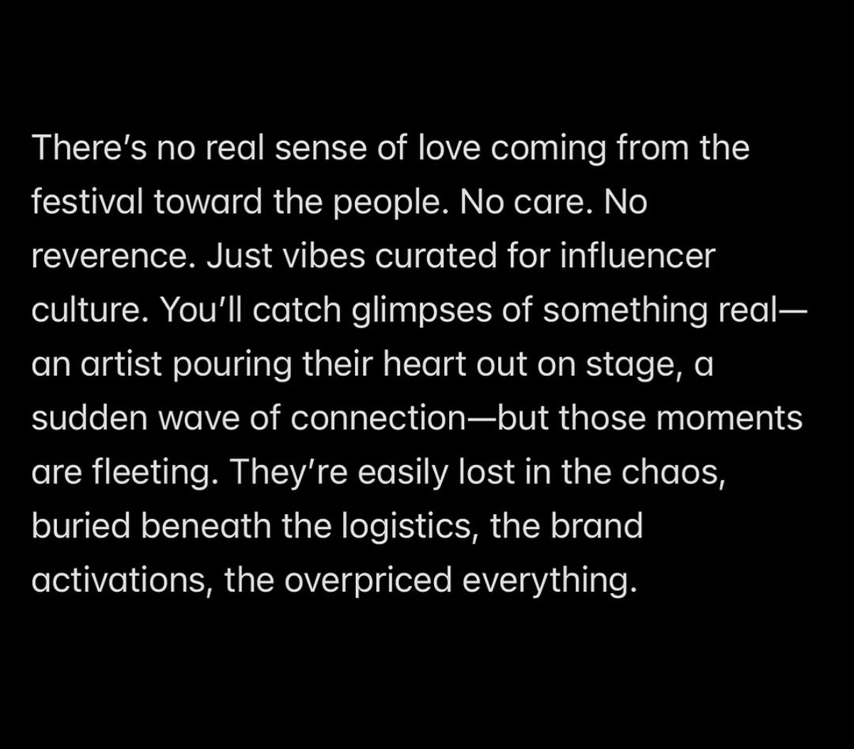 Coachella still boasts some incredible musical performances every single year, across both weeks, but the reality is it’s more of an ‘influencer scene’ than an actual music festival. The music is secondary for so many people hoping to catch a glimpse of celebrities or chase clout. That’s sad.