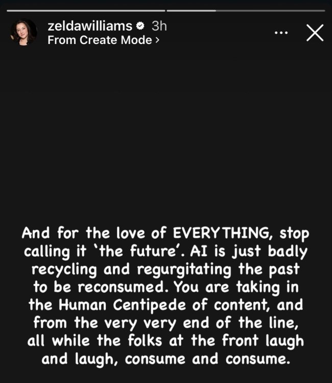 Zelda had already pushed back against A.I. while criticizing the Studio Ghibli trend that took the internet by storm earlier this year, and she drew a line in the sand while pushing back against the people who’ve insisted on sending her A.I. videos of her dad, referring to the practice as “making disgusting, over-processed hot dogs out of the lives of human beings.”
