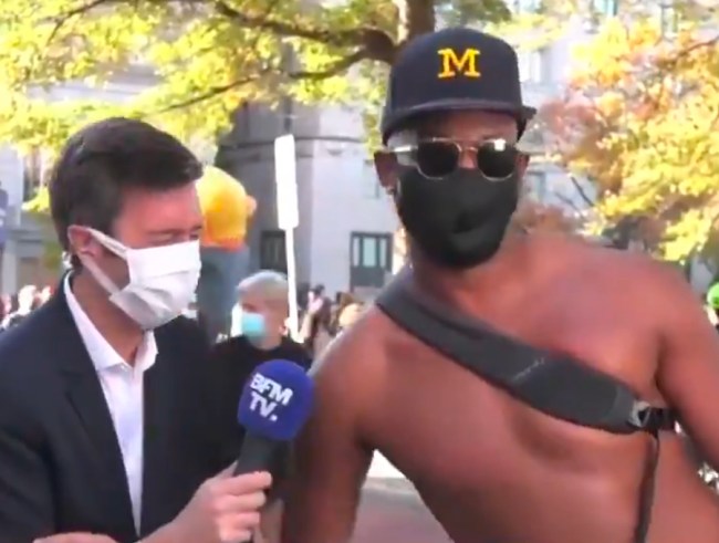 A journalist for French outlet BFM TV was reporting on Biden’s win when the shirtless guy cuts into the shot to let the man – and the world – know he’s got a deep love for all things French.