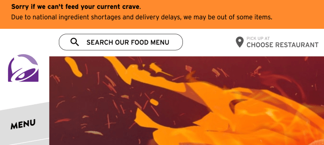 As of this writing, visitors to Taco Bell’s website are greeted with a banner that warns they may not be able to get their hands on some of their favorite items due to ingredient shortages that have been exacerbated by delivery issues.