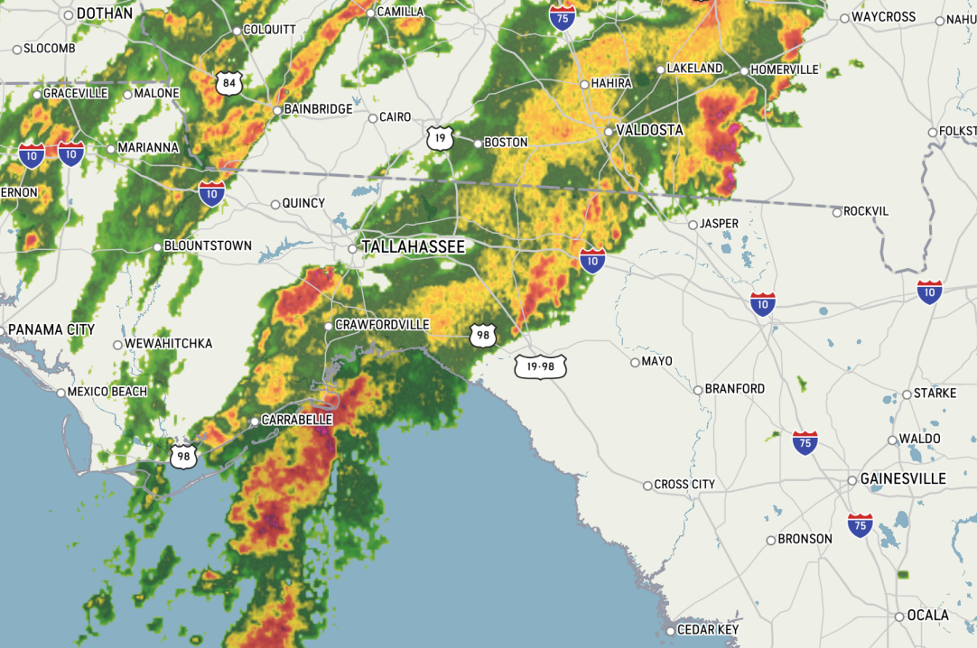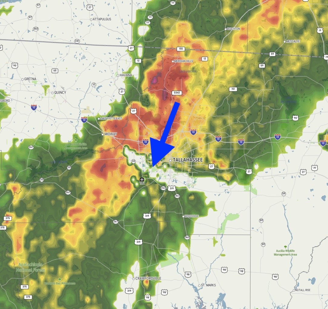 Monday is yet another example. Though not nearly to hurricane strength, a line of strong thunderstorms rolled through the region but Tallahassee stayed mostly dry. Take a look at the radar: