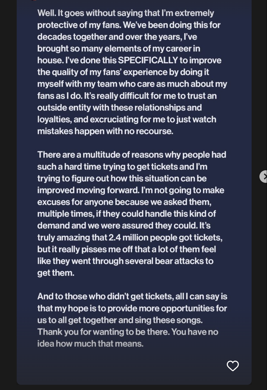 “There are a multitude of reasons why people had such a hard time trying to get tickets and I’m trying to figure out how this situation can be improved moving forward. I’m not going to make excuses for anyone because we asked them, multiple times, if they could handle this kind of demand and we were assured they could. It’s truly amazing that 2.4 million people got tickets, but it really pisses me off that a lot of them feel like they went through several bear attacks to get them.”