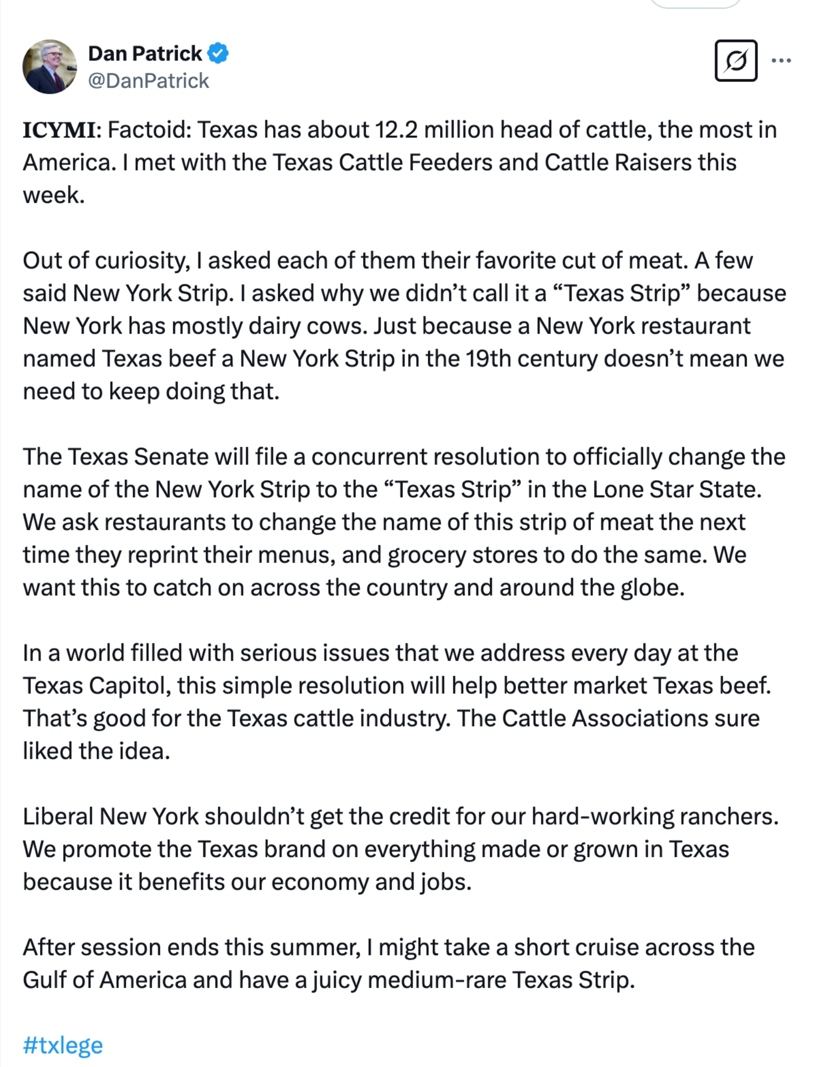 Are there bigger problems to be solved in Texas? Well, he addressed that too but seemed to suggest that this is a big problem and that they’re already solving all of the other really big problems at the Texas Capitol. Here is what Texas lieutenant governor Dan Patrick had to say about rebranding NY Strip as the Texas Strip because steak comes from Texas and “Liberal New York shouldn’t get the credit for (Texas’) hard-working ranchers.”