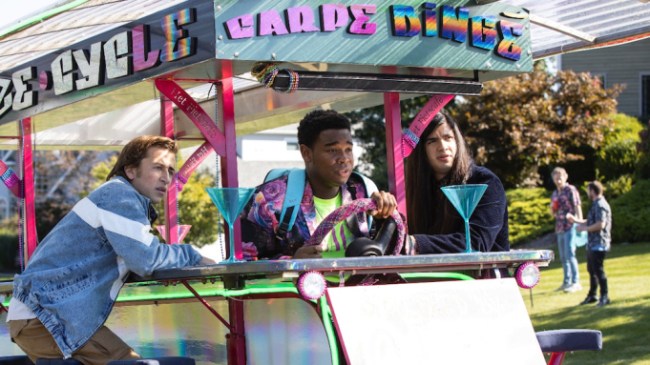 The Binge is a classic “where’s the party at?” comedy a la American Pie, Project X, Superbad, Blockers, and Good Boys. It follows three high school buddies – Griffin, Hags, and Andrew – played by Skyler Gisondo, Dexter Darden, and Eduardo Franco. Much like the Jonah Hill and Michael Cera dynamic in Superbad, these three are looking to get after it and make some memories on the first night they can legally partake in The Binge. Except the school’s principal – a mustached Vince Vaughn – is adamant about keeping the group away from the partying associated with The Binge, as well as foiling the romance brewing between Griffin and his daughter Lena, played by Grace Van Dien.