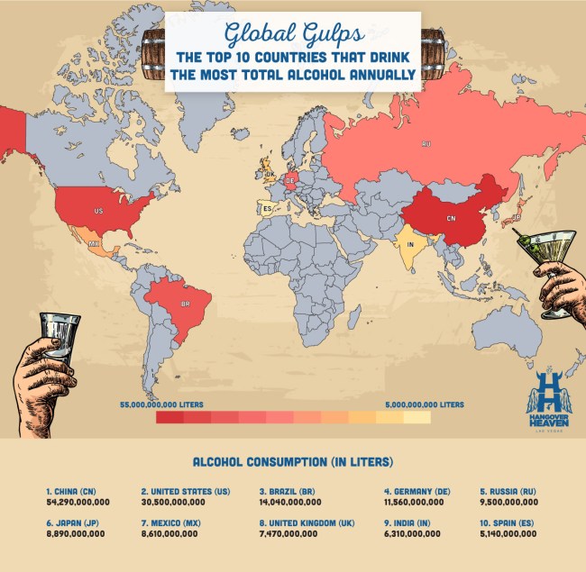 They first took a look at total annual alcohol consumption and I doubt you’ll be too surprised to see some of the world’s most populous countries led the pack.
