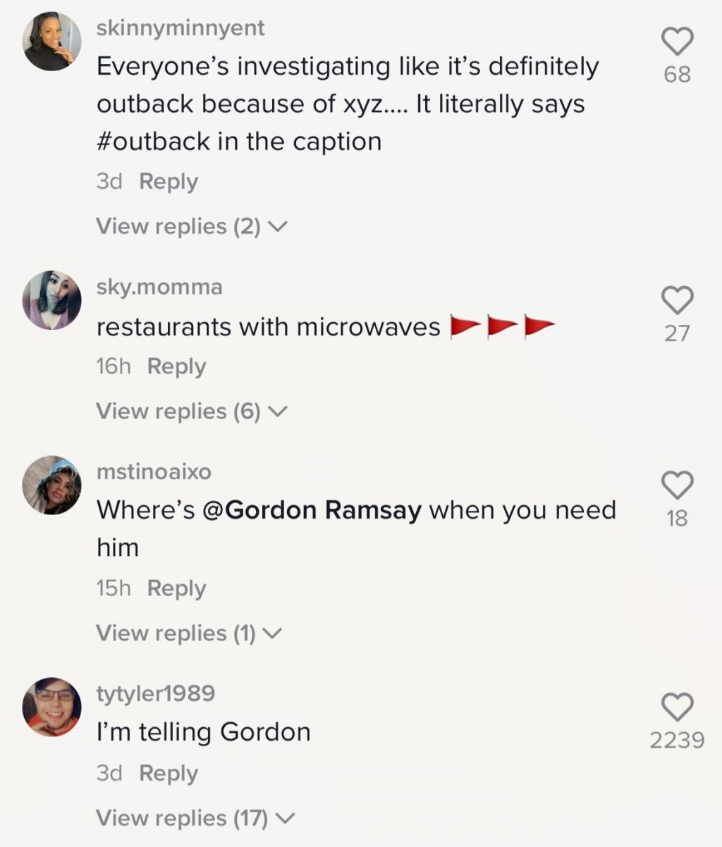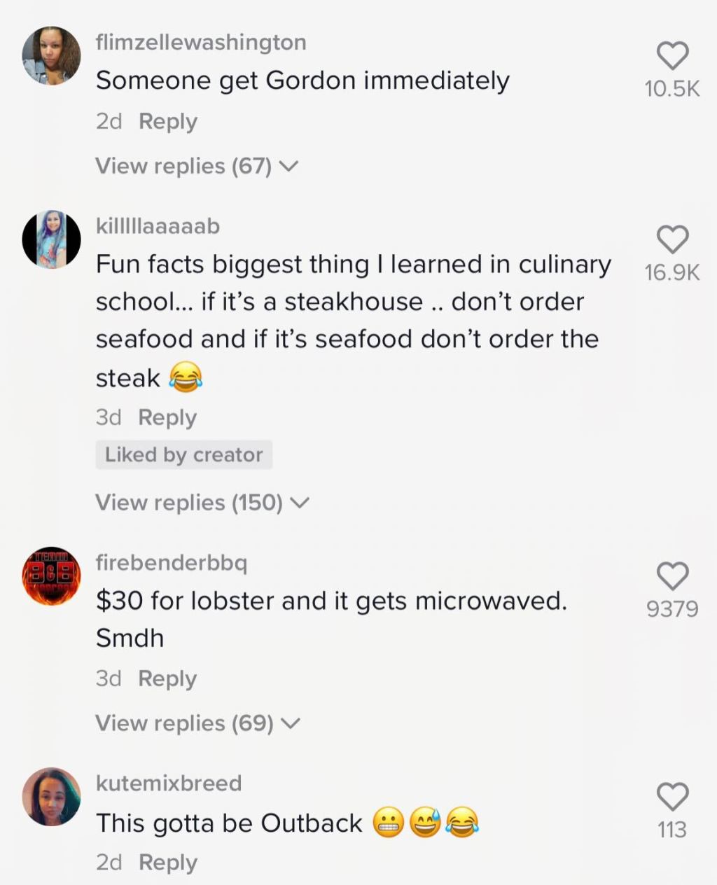 The comments are all over the place but the thousands of people leaving comments all seem to agree that someone needs to alert Gordon Ramsay about this Outback Steakhouse Lobster atrocity taking place.