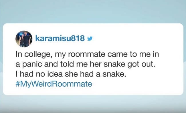 Moved in with a guy who had a huge horror movie collection. When I asked, “So, you a horror movie fan?” He said “No, just taking notes.” That was day one. #MyWeirdRoommate
