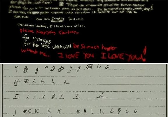 I haven’t seen the documentary myself, but there’s supposedly a scene in which a ‘handwriting practice sheet’ is found in the widow Courtney Love’s bag. This leads forensic experts to posit that she potentially was practicing Kurt’s handwriting and from there the conspiracy theories take off: