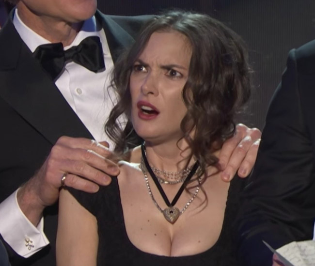 The expressions #WinonaRyder gave on stage are strikingly similar to that of a college kid trying not to act high in front of their family