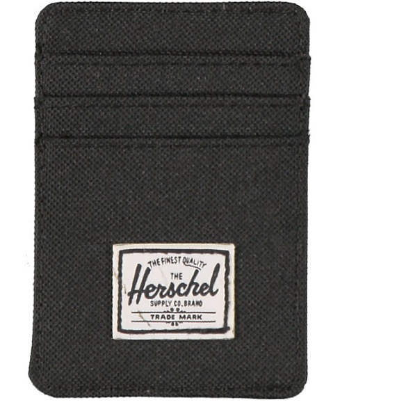 Herschel Roy is a 100% polyester flap closure wallet. It’s made with an RFID blocking inner layer fabric to protect you from identity theft and features enough pockets to hold up to 8-10 cards while staying slim in your jeans.