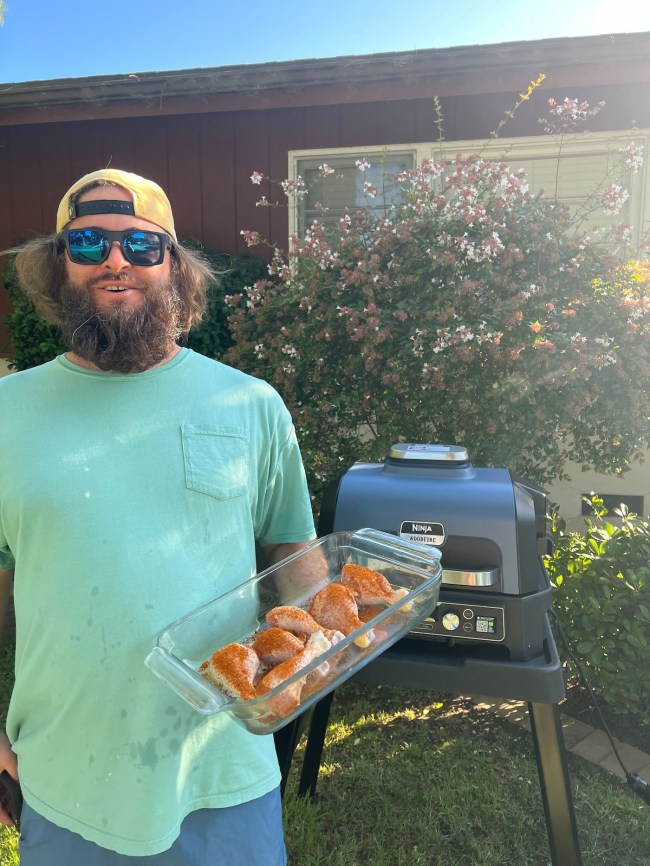 I tried the chicken thighs at a lower and slower cook than the setting in the Ninja Proconnect app, cooking them at 250 until they reached 165 degrees using the thermometer. Because the grill was already pretty hot, it only took about 40 minutes. The result was even more tender and juicy, complete with a sort of smoky crispiness to the skin that I left on the outside of the thighs.