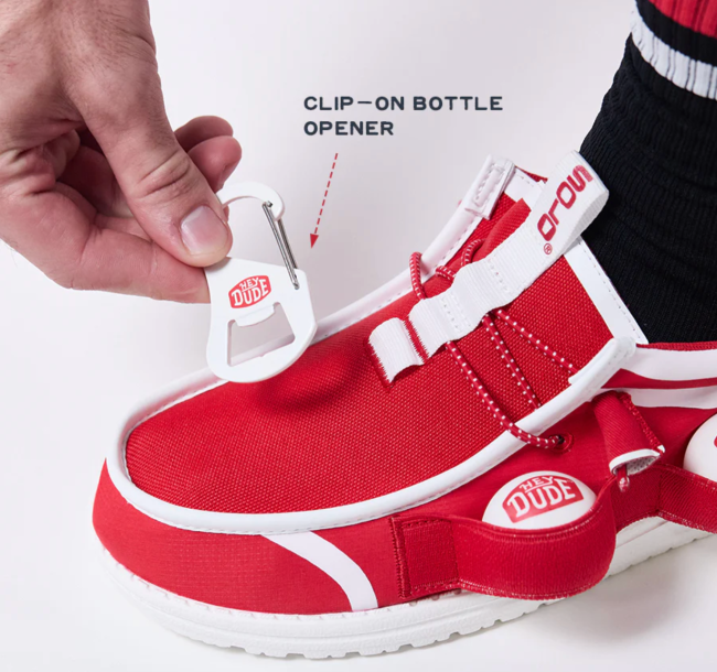 Of course, style and HEYDUDE’s signature comfort weren’t enough for this collab. Take a closer look at the Weekend Warriors. These shoes are equipped with a clip-on bottle opener, ping-pong ball holders, and a built-in measuring tape for official shot lengths to enforce “no elbow” rules.