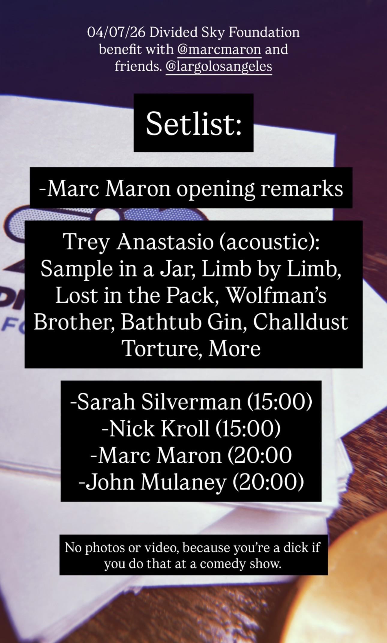 The other reality-bending highlight of my week was hitting up Marc Maron’s Divided Sky Foundation benefit at Largo in West Hollywood to support Trey Anastasio’s Vermont rehab center. Big Red himself came out with the acoustic guitar and ripped a killer set that had the entire room singing along like a campfire (though I tragically missed “Back On The Train” at the end because of course I did). Here’s a clip The Largo shared on Instagram:
