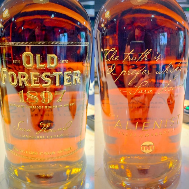To commemorate Season 2 of The Alienist on TNT, Old Forester has released a limited-edition signature bottle of their 1897 Bottled in Bond (BiB) Whiskey. Here you see a bottle that was created by Old Forester specifically for the actors (and media) as a really special way to commemorate the launch of Season 2. This season takes place in 1897 so this was a natural fit for their exquisite 1897 BiB whiskey. On the show, Dakota Fanning plays a bourbon-loving detective named Sara Howard so this was a natural fit. TNT and The Alienist ahve also partnered with creators to put out old fashioned glasses selected by the Death & Co. team, a silk fabric from Bergdorf Goodman, unique scents crafted by perfumerie D.S. & Durga, and a custom bottle of Delmonico’s Steakhouse classic steak sauce.