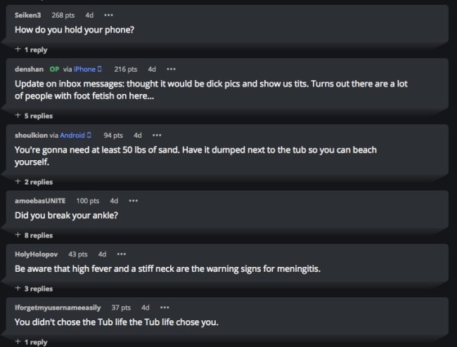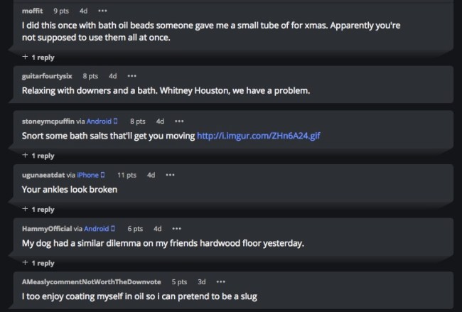 She was, however, able to post a picture of her predicament to Imgur, the caption reads “ I’ve go a chest infection and some fever so I’m home sick. I also can’t turn my head. Took some antibiotics and a Valium and thought- i will have a relaxing bath. I found some bath salts. Lit some candles and poured in some coconut oil- now I am realising it was too much coconut oil. Went to get out after pulling the plug and I just slide around like a giant greased up potato in a roasting dish. There is no traction. No grip. Just me and my fat body slipping around covered in oil. Fuck home beauty remedies. SOS”