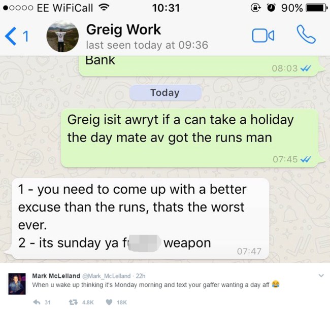 Some Scottish dude with a bizarre dialect made the crucial misstep of going with “the runs” excuse. This is JV material. What’s even more JV is what his boss called him out for next.
